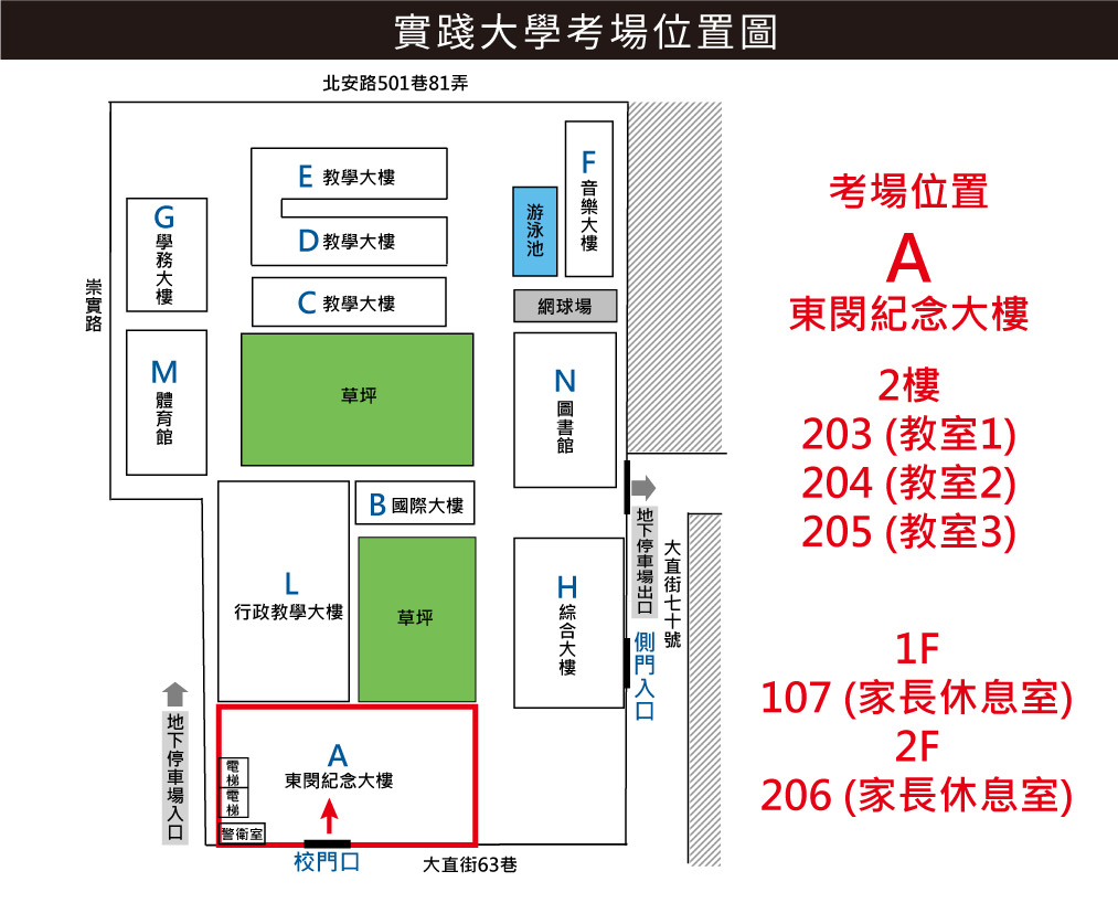 行經建國高架道路(北上方向)→往基隆方向中山高速公路匝道→濱江街交流道→大直橋→下橋 直行崇實路→右轉大直街62巷本校正門口