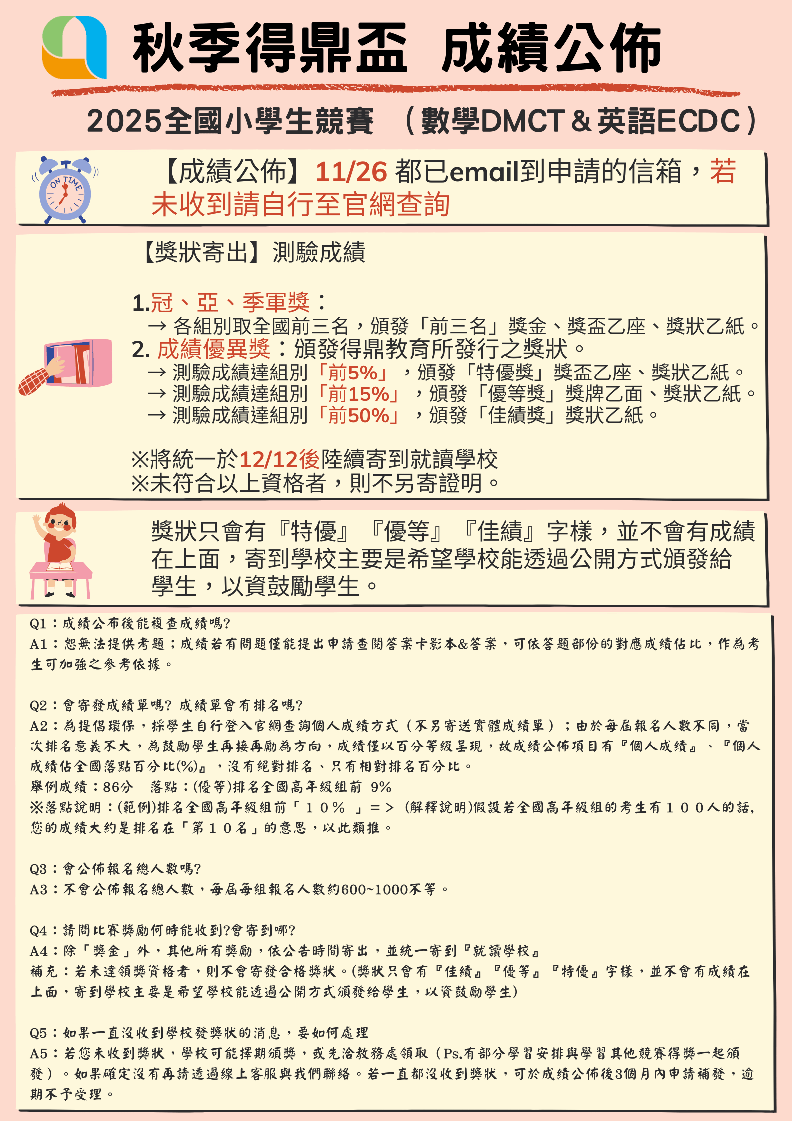 【成績公佈】2025秋季全國得鼎盃 數學DMCT & 英語ECDC競賽